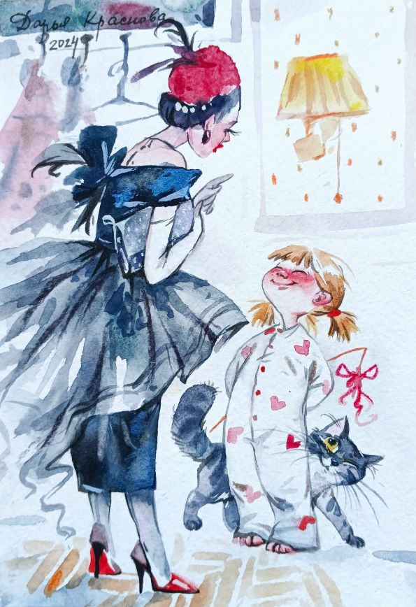 Картина художника-иллюстратора Дарьи Красновой "И слушайтесь бабушку!" Авторская работа. Бумага, акварель, 21х15 см.