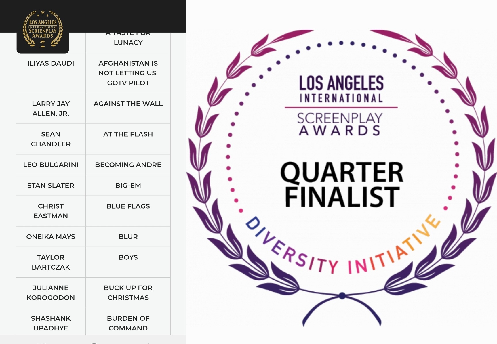 * «Los Angeles International Screenplay Awards» DIVERSITY XII — Quarter-finalist «AFGHANISTAN IS NOT LETTING US GO» TV Pilot 3.10.2025 Los Angeles, California, USA https://lascreenplayawards.com/result/