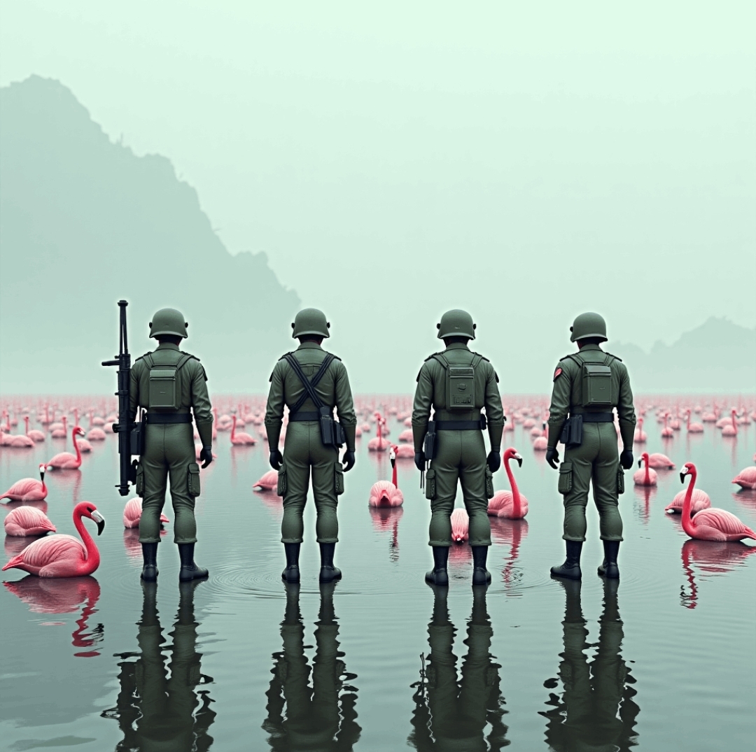 Пройдя через портал группа военных из 2424 года оказалась на берегу озера. Кругом, куда ни глянь, бродили удивительные розовые птицы.