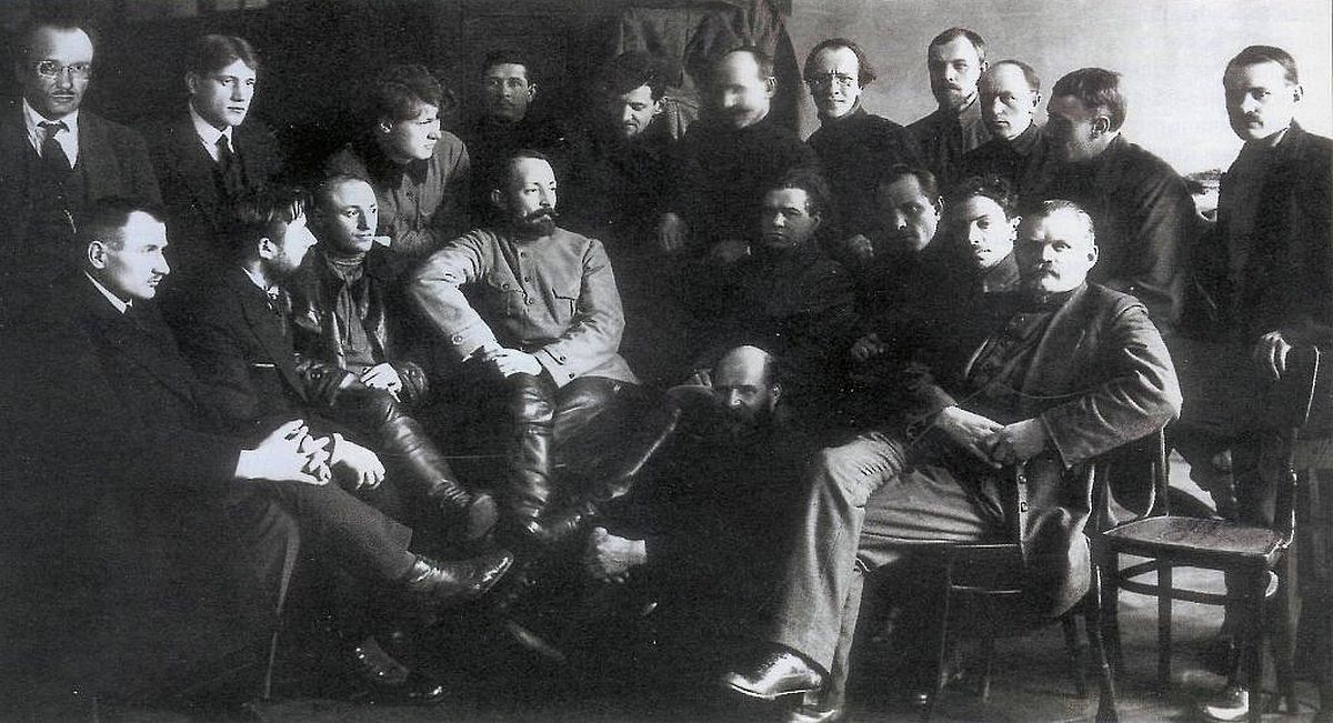 Иллюстрация. 1918 год. Москва. Ф.Э. Дзержинский с руководителями и сотрудниками ВЧК. На переднем плане справа, на стуле сидит заведующий отделом заведующим отделом ВЧК по борьбе со спекуляцией и одновременно заведующий инструкторским отделом ВЧК Василий Васильевич Фомин.
