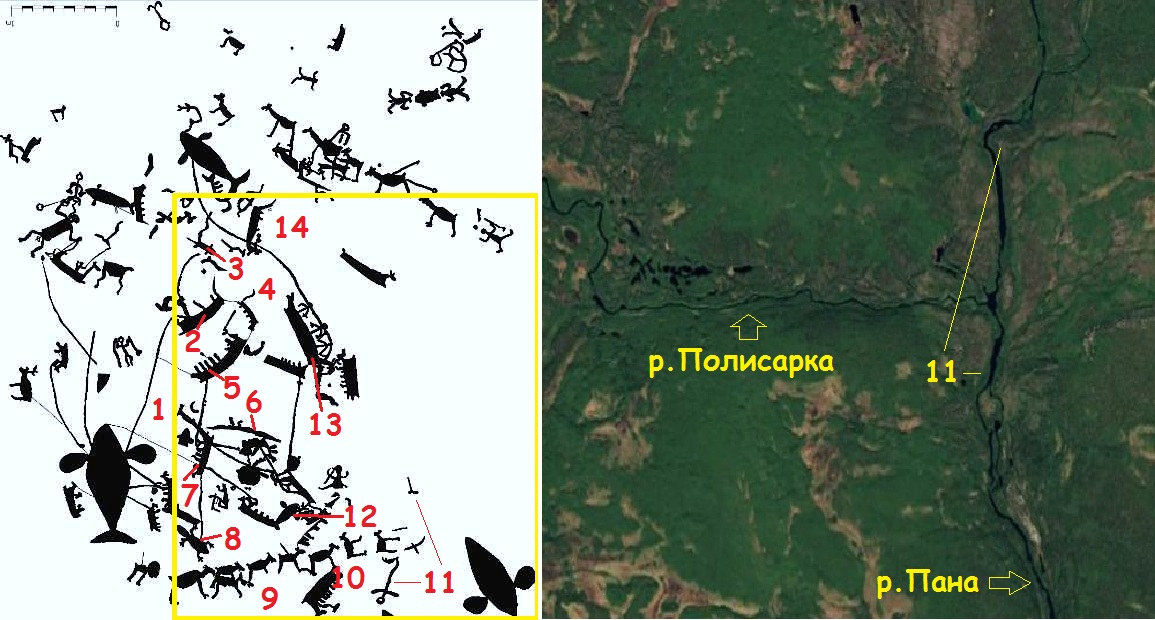 11. группа петроглифов, обозначающих характерные места при впадении реки Полисарка в реку Пана.