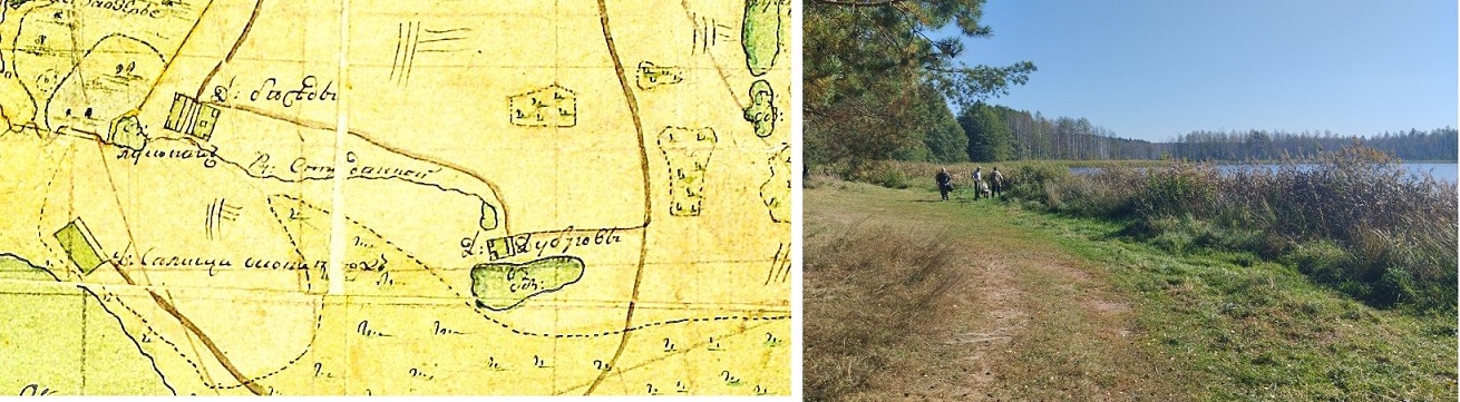 На снимках: фрагмент землемерной карты 1810-1816 годов, с выделением Дубров и Бесед; на берегу Луконца сегодня.