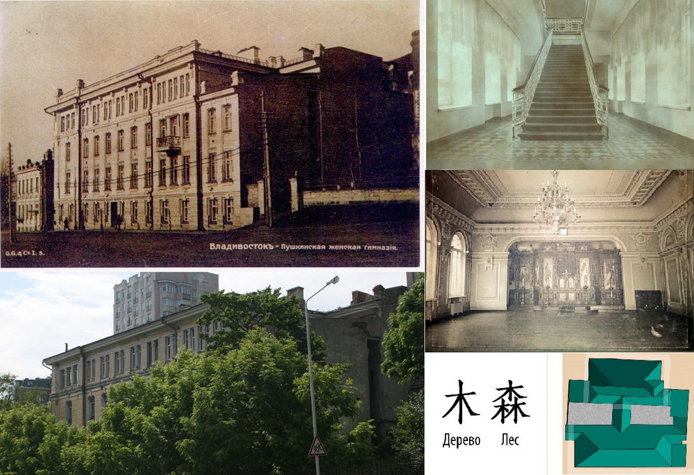 Но сходящиеся под углом корпуса – что это? Просчёт архитектора Плансона? Восторгаясь идеальной геометрией Владивостокского вокзала, в это трудно поверить. Ошибка строителей? Но строительство велось под руководством архитектора. А может быть, это решение позволило немного ускорить и удешевить строительство? Гимназия, скрытая в глубине участка, с улицы Пушкинской не кажется очень уж большой, но на самом деле глубина её значительнее, чем ширина, и чтобы разместить проект на местности, пришлось долбить скалу в её тыльной части. Главный корпус расположен параллельно улице Пушкинской, а тыльный, служебный корпус немного повернули по часовой стрелке. Может быть, чтобы меньше врезаться в скалу и уменьшить объём земляных работ? Площадь внутренних помещений практически не изменилась, а месяц-другой строители могли выиграть. А может, таким хитрым способом просто хотели удлинить галерею, связывающую оба корпуса, чтобы изящнее расположить парадную лестницу внутри? Кто знает…
