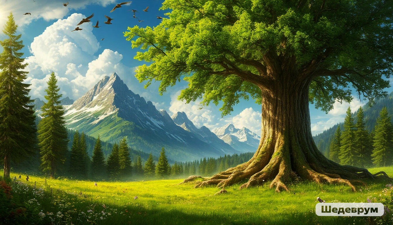 Перед ней простиралась солнечная поляна, окаймлённая лесом, где щебет незнакомых птиц вплетался в мелодию, звучавшую из книги. Вдали высился горный массив, его вершины терялись в пушистых облаках. Но больше всего её поразило дерево. Исполинское, величественное. Его ствол был широким, как башня, а могучая крона уходила так высоко, что и вправду исчезала в небесной выси.