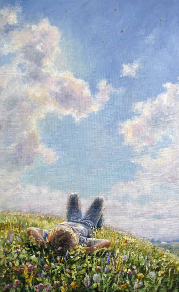 мечтательно в небо глядит