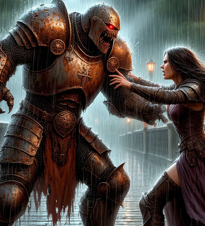 Был ли это рыцарь?! Непременно да. Но что с ним стало! Плесень с ржавчиной облепила благородный клинок и сияющие латы, из под коих выпирали нечеловеческого вида поросшие шерстью части тела с необычайно большими мышцами. Кое-где торчали обломанные стрелы. Виднелись грозные шрамы. И столь близкие сердцу девушки потускневшие алые глаза в забрале грязного шлема, что источали лишь безумие. Нельзя описать словами, что за боль и отчаяние пронзило Марию. Ведь это был её рыцарь. Она вскрикнула, когда увидела того самого якобы «монстра», и не спеша двинулась к нему. Шагнула на мост. Медведь тут же ухватил девушку зубами за шиворот, но мгновенно получил хлёсткий удар по носу и магический порыв ветра заставил его кубарём откатиться прочь. Мария пошла вперёд. Очнулся и рыцарь, оторвав затуманенный взгляд от бушующей реки. Он сдвинулся с места навстречу непрошенной гостьи с единственной нескрываемой целью, обхватив уродливой рукой рукоять меча. Воин шёл биться.