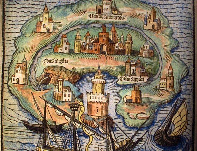 По Мору, круглый остров утопийцев диаметром 740 км имеет во внутренней своей части тихую обширную гавань, защищенную от проникновения в нее чужеземных судов утесами, отмелями и подводными скалами, проходы между которым известны только лоцманам. «Повсюду спуск на берег настолько укреплен природою или искусством, — пишет Мор, — что немногие защитники со стороны суши могут отразить огромные войска». Далее автор сообщает, что эта страна не всегда была окружена морем. Легендарный король «Утоп, чье победоносное имя носит остров, …распорядился прорыть пятнадцать миль (22 км), на протяжении которых страна прилегала к материку, и провел море вокруг земли».