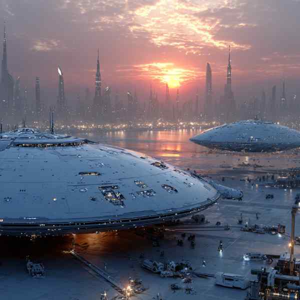Эскадра Кроссби-кораблей (машин времени) перед началом старта в прошлое, в доисторические эпохи для заселения молодой Земли в тех временах, когда на Земле ещё не было людей.