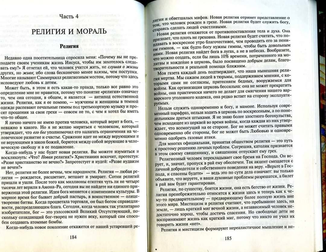 Меня на этот вывод подтолкнул его разговор с одной девочкой-подростком, которая уезжала от него. Таких детей было очень немного за историю Саммерхилла. Девочка дала ему понять, что ей не хватило справедливости. И тут я понял, что реальным было воспитание справедливостью, а не свободой.