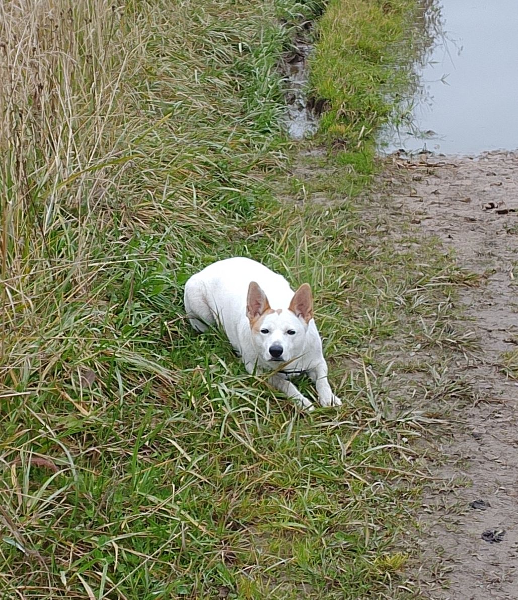 Вышел я за забор. Пройдя немного, действительно увидел на обочине собаку,спереди очень похожую... Но лишь спереди:это оказался кобель с рыжими спиной и боками и белым низом. А размеры и форма как у Сони, особенно окраска головы похожая. Хвост такой же:недозакрученный.