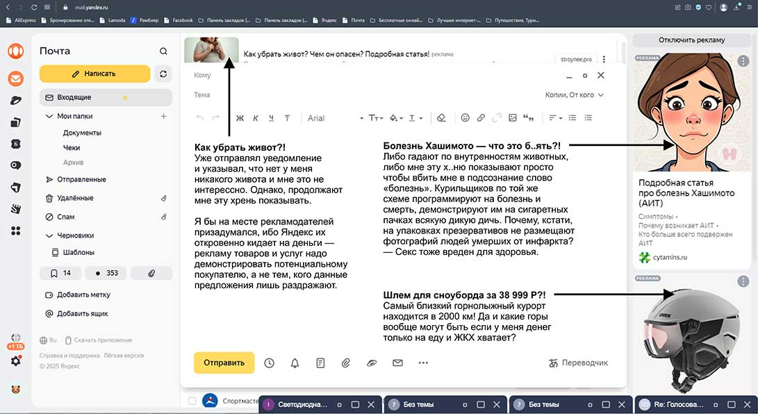 Отдельно хочу отметить, что функционал Яндекс, при написании письма, не позволяет развернуть поле письма на весь экран, чтобы рекламных баннеров с отвлекающим, раздражающим и шокирующим контентом не было видно. Если я при написании письма пытаюсь закрыть рекламу, то страница моего письма автоматически сворачивается. Короче, все умышленно сделано так, чтобы по средствам созданного неудобства, подвигнуть пользователя на покупку платной услуги по отключению рекламы. Еще раз повторю, то, что мне Яндекс демонстрирует по определению не является персональной рекламой, потому, что мне демонстрируется то, что не соответствует моим вкусам, предпочтениям и потребностям от слова — совсем. Это рэкет, — сами создают неудобства пользователям, и сами предлагают их устранить за плату.