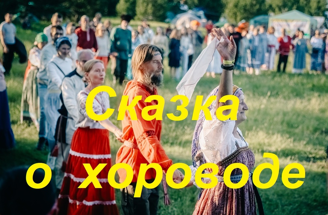 Оба ведущих хороводника подняли вверх руки. Затем, посмотрев друг на друга, взмахнули ими, и начали движение. Все люди, взявшись за руки, пошли за помощниками хороводниками, и соединились в большой круг.