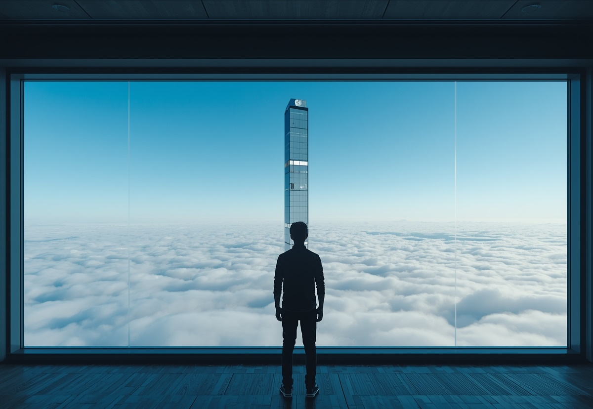 Прямо напротив панорамного окна стоял внушительных размеров объект, скрытый под плотной брезентовой накидкой. Угадывались лишь угловатые очертания. Рядом валялись отрезки алюминиевого профиля и катушки с кабелем. Окно было идеально чистым, и сквозь него открывался тот самый вид, который Ян видел лишь на экране. Башня Р16 стояла в ослепительном солнечном свете, а внизу, под окном, простирался ровный, бесконечный ковер облаков, скрывавший серый туман, который так знаком Яну.