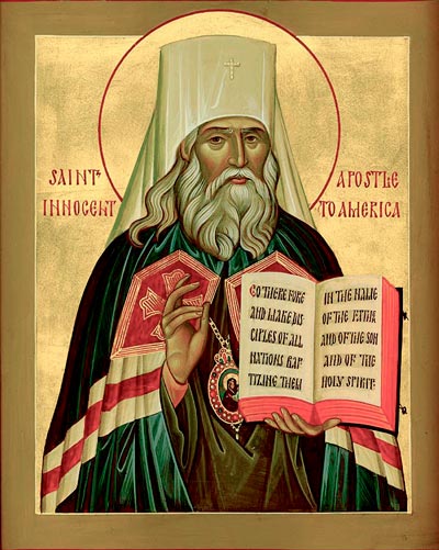 Святитель Иннокентий Московский (мирское имя Иоанн Вениаминов) родился 26.08.1797 г. в селе Анга (Ангинское) Иркутской губернии в семье пономаря. В 1817 г. Иоанн рукоположен во диакона, в 1821 г. – во иерея, в 1823 г. направлен для миссионерской деятельности на Алеутские острова. На острове Уналашка он возвел церковь Вознесения Господня, проводил службы, пастырские беседы, крестил многих алеутов. Он создал алеутский алфавит на кириллической основе, сформулировал основы грамматики, составил и опубликовал первый алеутский букварь. Отец Иоанн перевел на алеутский язык Евангелие от Матфея, катехизаторские труды святителя Филарета Московского, основные молитвы и церковные песнопения.
