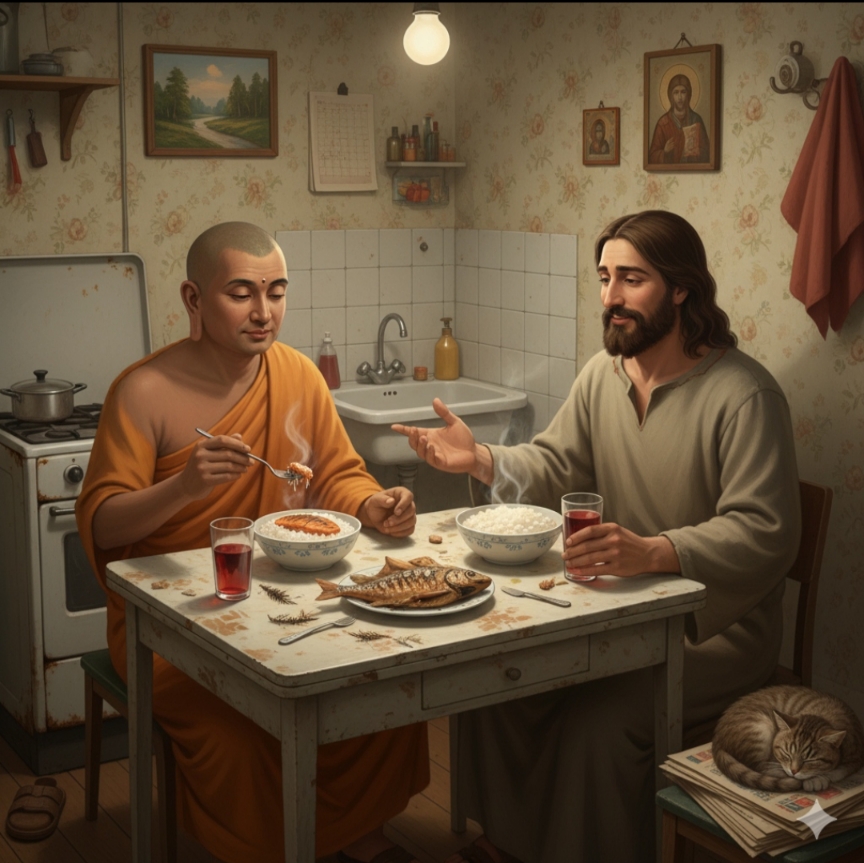Он был аватарой равновесия, и от этого ему не становилось легче. Гаутама Сиддхартха ел рис. Иисус из Назарета пил вино. Безымянный жевал «Вискас» из кошачьей миски, чувствуя, как гранулы, пахнущие условной рыбой, растворяются во рту, оставляя послевкусие грубой, неприукрашенной дхармы. В его рюкзаке с гаечными ключами и паяльником лежала потрёпанная книга Ошо. Он никогда её не читал. Она была ему не нужна. Она была якорем, тяжёлым, материальным свидетельством того, что кто-то другой тоже пытался говорить об этом, и это придавало его собственному безмолвному существованию некую легитимность. Иногда он просто клал на неё паяльник, чтобы не искать подставку.