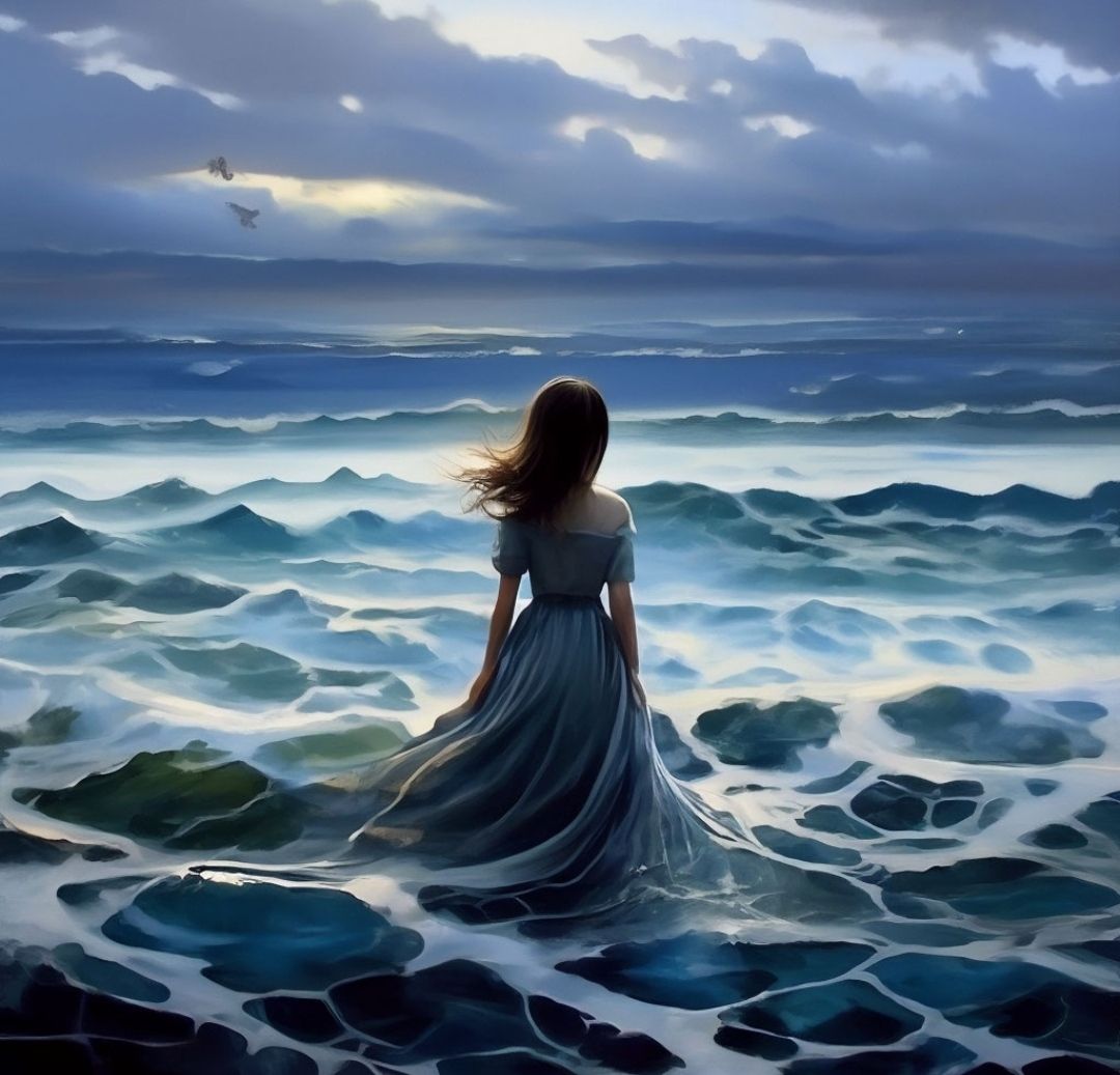 Океан монотонно накатывал свои серые волны на берег и этот звук успокаивал девушку, она была очень благодарна океану за это. Часто девушка выходила из пещеры и шла к океану переполненная благодарностью и нежностью. Она заходила по колено в воду и гладила волны океана, так она благодарила и нежно его ласкала, отдавая то, что в ней было. От этих ее прикосновений океану было невыносимо больно и он плакал дождём, девушка убегала, ничего не понимая, и пряталась в своей пещере.