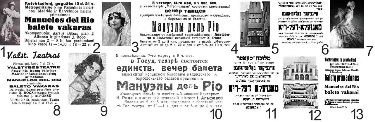 2.Афиша на литовском языке: 13 мая (1937 г.) в к/т “Metropolitain” балетный вечер примадонны Мануэлы дел Рио. Аккомпанируют испанские пианист и гитарист.