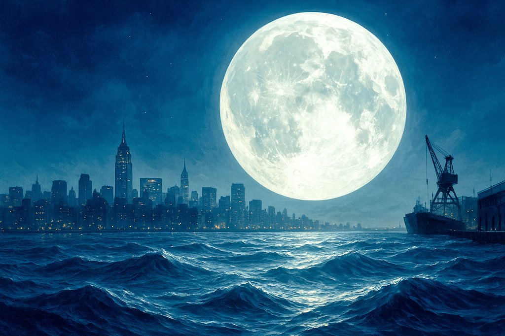 Щедрый, но капризный свет отражался в окнах и на мокрых мостовых, превращая город в мозаику из бликов и теней. Никто ещё не знал, что эта ночь станет первой, когда спутник Земли подойдёт ближе. Настолько близко, что даже у воды появятся глаза — мерцающие, зыбкие отражения, будто океан сам подмигивал в ответ.