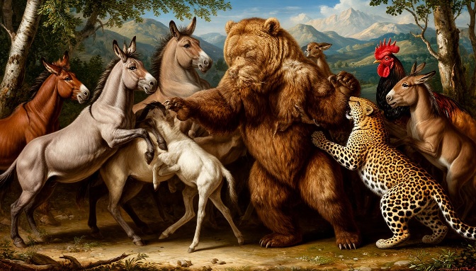 Первые минуты схватки были хаотичными. Ослов было много, они носились вокруг, пытаясь укусить и лягнуть Медведя. Петух же, с высоты ближайшего дерева, продолжал свои заливистые крики, словно дирижер безумного оркестра. Медведь, хоть и был силен, оказался в меньшинстве. Его мощные лапы могли нанести сокрушительный удар, но ослы были проворны и многочисленны. Они пытались загнать его в угол, окружить, лишить пространства для маневра.