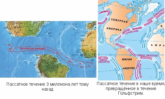 Особое место в этой картине занимает Панамский перешеек — тонкая полоска суши, соединившая Северную и Южную Америку около трёх миллионов лет назад. Именно его появление изменило океанические потоки "пассатных течений": прекратился свободный обмен вод Атлантики и Тихого океана, и из этой «точки бифуркации» родился Гольфстрим — тёплое течение, согревающее Европу и определяющее её климат до наших дней.
