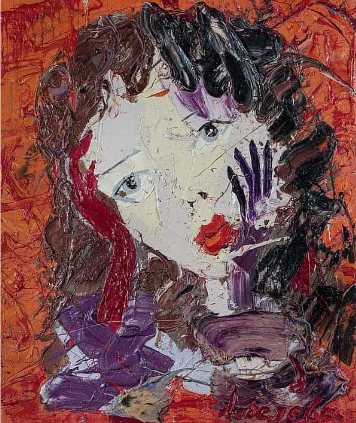 Масло, холст 120 см 100 см На картине ”Французская певица” в центре композиции изображено женское лицо, которое слегка наклонено. Портрет не стремится к фотореализму, он передаёт состояние женщины, с немного печальным взглядом. Перед нами не конкретная личность, а архетип певицы: женщины чей образ остаётся в памяти, она поёт и мир вокруг замедляется. На картине тёплый насыщенный оранжево-красный фон. Оранжевый символизирует жар сцены и свет софитов. Огненный фон вокруг лица усиливает эмоциональность картины. Фиолетовые крупные мазки ассоциируются с меланхолией и мистикой. Певица готовится к поворотному моменту своей жизни, она сосредоточена и репетирует, она жаждет изменений, трансформации, она мечтает стать знаменитой. Портрет демонстрирует уязвимость и стойкость человека, который идёт к своей цели, несмотря ни на что. Переход между прежней ”Я” в новое состояние. Картина передаёт внутреннюю борьбу между сценическим блеском и личной ранимостью. Художница использует толстые мазки, наслаивая фактуру, чтобы передать внутренний мир и напряжение женского образа. Краска наносилась густо мастихином, оставляя рельефные, почти скульптурные мазки.