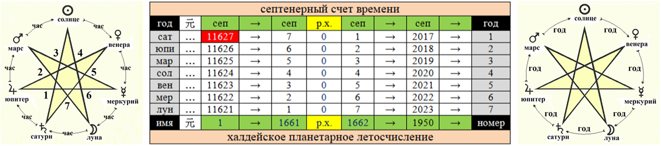 Здесь показано начало летосчисления, описанное в Пятикнижии Моисея/Тора/Бытие/Родословие Адама. 11627 год до р.х. = точка отсчета моисеанской календарной системы, подтвержденная халдейским септенером. Суть подтверждения = целосуточная делимость календ, проходящая через р.х. Этот год = начало, которое необходимо называть от с.м. || от сотворения мира, а все продолжительности жизни библейских «патриархов» = календы планет солнечной системы.