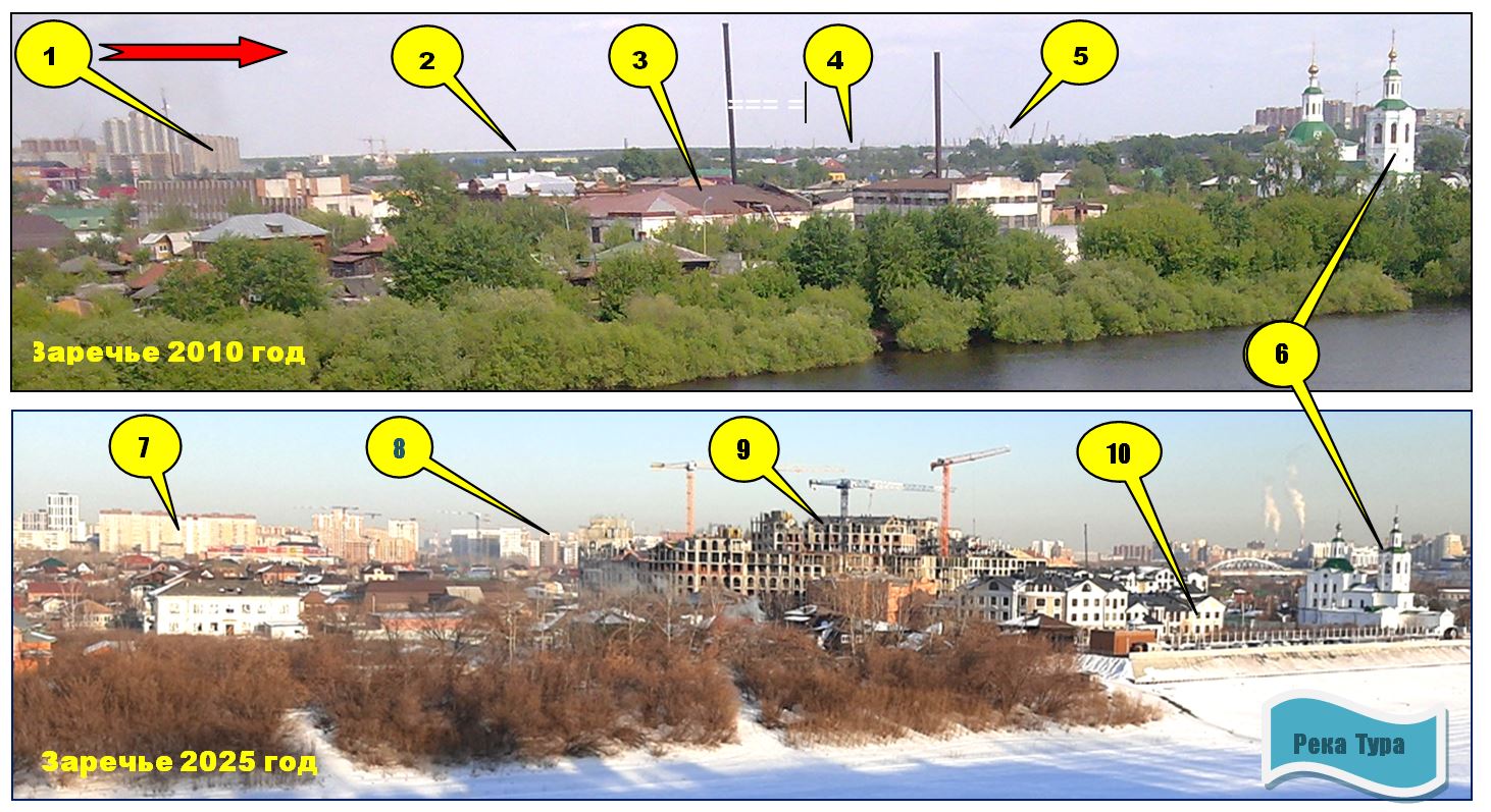 В настоящее время практически весь бывший заречный горизонт (позиция 2) с верхнего уровня набережной Затюменки и Исторической площади выглядит монотонной застройкой из многоэтажных «человейников» (позиции 7). Естественного горизонта практически нет.