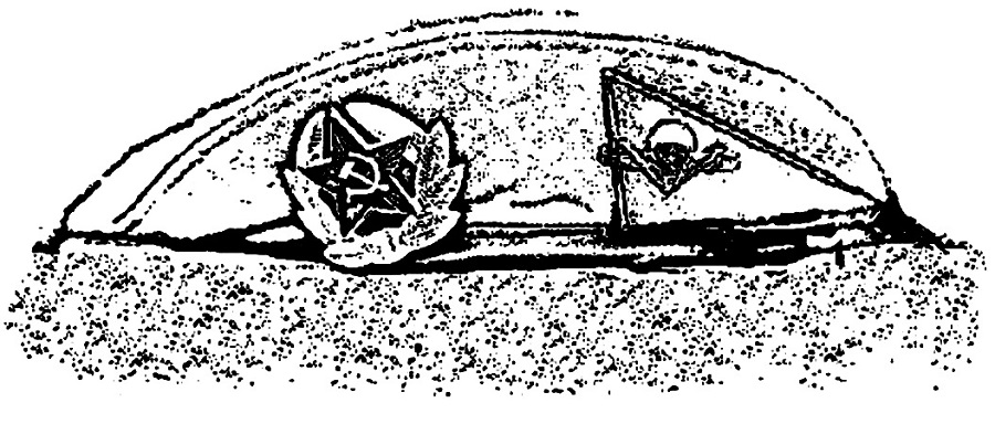 Почти у самого входа на одной из могил стоял большой чёрный обелиск, похожий на арку, которая была установлена на небольшом кургане. Надгробие представляло собой плиту чёрного мрамора, поставленную «на попа» и закруглённую сверху. Под сводом этой «арки» было круглое углубление, размером с большую тарелку, походившее на оттиск сургучной печати с силуэтом головы в профиль. Плита сверху донизу, по оси, словно молнией, была рассечена вертикальной трещиной. А ближе к низу, в этой трещине — установлен камень уже из коричневого мрамора в виде какой-то вертикальной капсулы или коробочки с фасками. Словно эта капсула упала с большой высоты и, врезавшись в вершину плиты, пробила её насквозь и застряла в нижней её части. А на этой капсуле красовалась подкрашенная золотистой краской латинская буква «U». Надгробная надпись гласила, что здесь покоится Герой Советского Союза, заслуженный лётчик-испытатель Грищенко Анатолий Демьянович.
