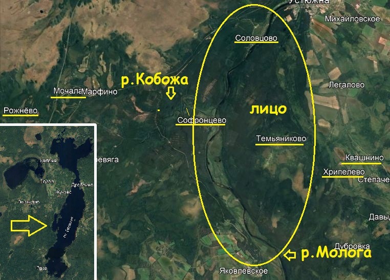 Дополнительным аргументом того, что слог "ко" имеет значение "наверху", это похожие гидронимы и топонимы с основой "кой" в названиях. "Кой" означает "верхняя губа", например река Койда http://proza.ru/2025/10/09/59, село Койгородок http://proza.ru/2025/09/29/97, которые также являются "лицевыми" гидронимами. И в случае с Кобожей, река впадает в "верхнюю губу лица" Мологи. Образуется вероятность двойного толкования: 1. Кобожа - это "верхняя губа", как и в представленных случаях 2. Кобожа - это "смотрящий вверх божок(водяной)". Определиться поможет исток Кобожи озеро Великое, которое имеет антропоморфную форму с "собачьей головой, смотрящей вверх", как видно на фото в углу. Название "великое(великая)" давалось гидронимам, которые также имеют на карте вид антропоморфного существа, либо животного, которые смотрят "в небо", пример река Великая http://proza.ru/2025/09/26/1345. Масштаб подобных гидронимов большой, это говорит о каком то важном значении такого символизма, которое пока непонятно.