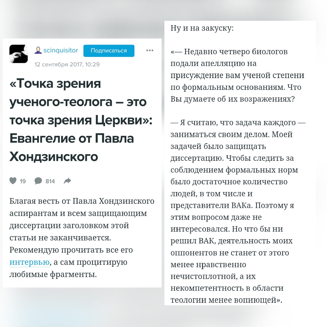 — Я считаю, что задача каждого — заниматься своим делом. Моей задачей было защищать диссертацию. Следить за соблюдением формальных норм было поручено достаточному количеству специалистов, в том числе и представителям ВАКа. Поэтому я даже не интересовался этим вопросом. Но что бы ни решил ВАК, деятельность моих оппонентов не станет менее нравственно нечистоплотной, а их некомпетентность в области теологии — менее вопиющей».