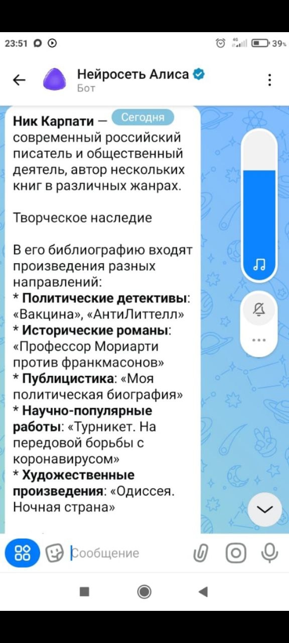 Вовсе не трилогия о трансгуманизме Виктора Пелевина, по гамбургскому счёту, является в современной российской литературе манифестом искусства тирансгуманизма, а три книги известного писателя Ника Карпати, объединённые названием КНИГА ЕВРОПЫ. ИЗ ПУТ (Русский Фауст, Всемирный посол бега, Моя политическая биография).