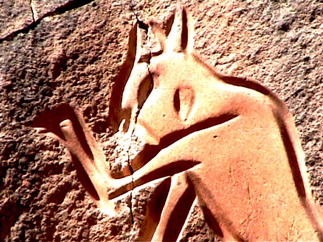 Через несколько десятков метров - новая тайна. Высоко, на самом гребне скалы - фигуры человекоподобных зверей, то ли кошек, то ли пантер, танцующих на задних ногах. Кто же это? И почему «творческий гомо сапиенс» приложил столько усилий, чтобы выдолбить эти линии в твердом граните?