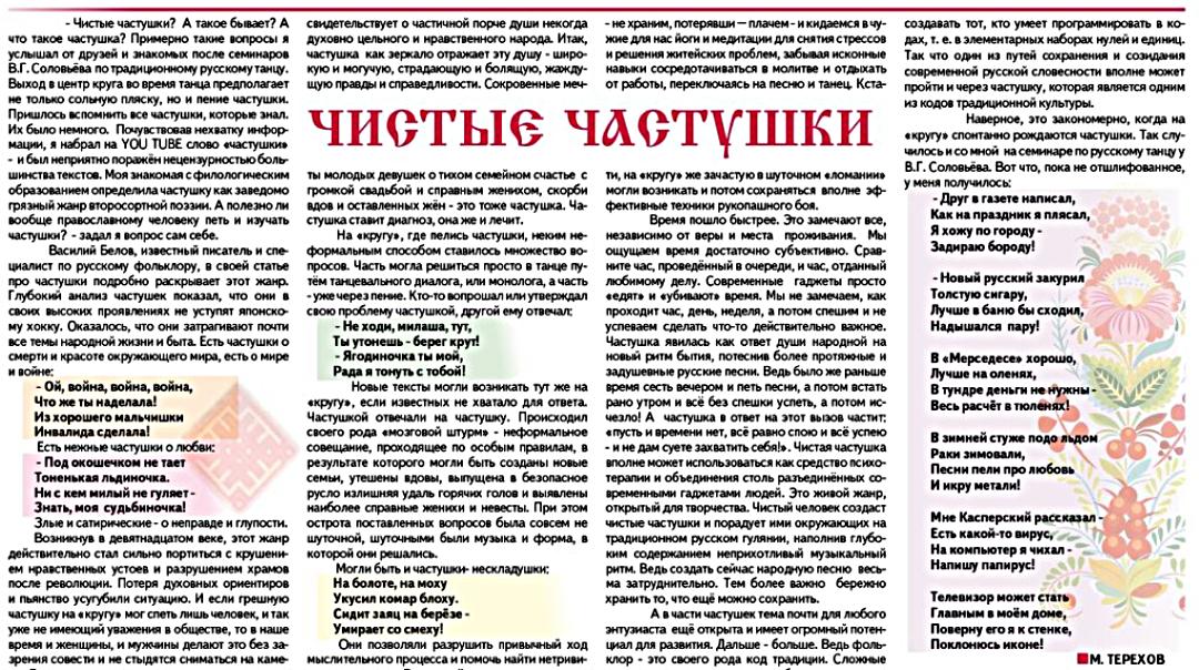 - Чистые частушки? А такое бывает? –А что такое частушка? Примерно такие вопросы я услышал от друзей и знакомых после семинаров В.Г. Соловьёва по традиционному русскому танцу. Выход в центр круга во время танца предполагает не только сольную пляску, но и пение частушки. Пришлось вспомнить все частушки, которые знал. Их было немного. Почувствовав нехватку информации, я набрал на YOU TUBE слово «частушки» - и был неприятно поражён нецензурностью большинства текстов. Моя знакомая с филологическим образованием определила частушку как заведомо грязный жанр второсортной поэзии. А полезно ли вообще православному человеку петь и изучать частушки? - задал я вопрос сам себе.
