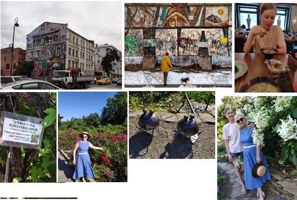 Саша проснулась недовольная, и я, чтобы развеселить ее, предложила прокатиться на колесе обозрения в парке неподалеку, мы в первый же день попытались на нём прокатиться, но не получилось из-за сильного ветра. На этот раз сложилось удачнее, и мы смогли обозреть окрестности с высоты, спустившись с которой и пройдя мимо стадиона «Динамо» (тот, что мы видели ежедневно со стороны набережной), заглянули в сквер городов-побратимов Владивостока с мраморными арками с названиями.