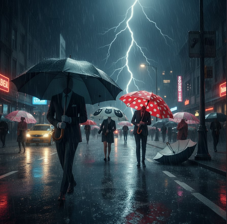 А я? Я просто чёрный зонт. Мой хозяин — бухгалтер. Его жизнь расписана по часам, а я в этом расписании занимаю почетное место "вещь, которая может пригодиться, но чаще всего не нужна".