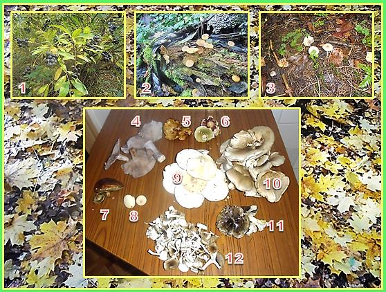 Из трубчатых в этом походе попались только два польских грибочка (7). Один из них был очень маленьким, но его шляпку то ли поцарапала белка, то ли обкусал слизняк. А вот и пара молодых шиповатых дождевиков (8) – могут по погоде ещё нарасти. Не зря есть поговорка со времён легендарного Ноя – «всякой твари – по паре». Пара стареньких серых рядовок (серушек) тоже пошла в корзину (11). Впервые попались белошляпые белые рядовки (9) – целая семейка в одном месте, а их бурошляпые большие сестрицы (10), как и в недавних походах по Криушинскому лесу, тоже небольшими группками и в одиночку попадались в разных местах.