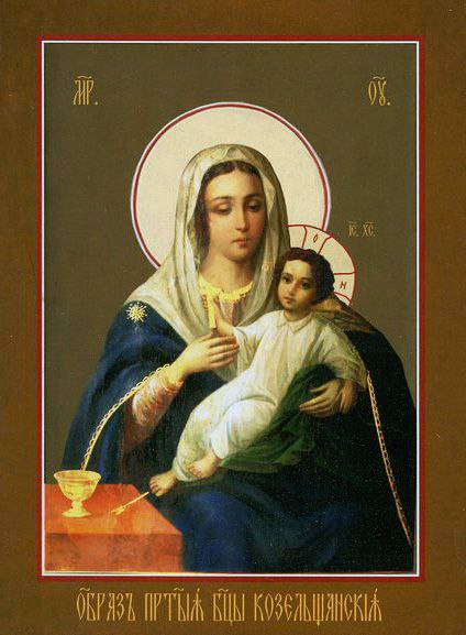 Празднование иконы Божией Матери "Козельщанской". На Полтавщине она прославилась и сколько помогает эта чудная, простая, деревенская икона, которая хранится во обители Святой Козельщанской! Как Живая Царица Небесная перед нами, Питательница, питающая Христа. В Руках Богомладенца Крест - символ грядущих страданий, символ искупления всего рода человеческого. Для меня особенно дорога эта икона. Когда лежал я в больнице на смертном одре (в 1998 году), страдания, казалось, были неимоверными. Когда почки остановились, на 80% уже ты мёртвый человек лежишь, жуткие боли, жуткая жажда - это невозможно передать! Мне теперь понятно слово Христово, на Кресте сказанное: "Жажду!" Когда хочется хоть глоточек сделать, а нельзя, организм не принимает. И вот в этот момент внушение было мне грешному: "На праздник Козельщанской Божией Матери будет поворот - или умрёшь, или останешься жив". Молились со слезами у Козельщанского образа все братья и сестры. И ещё четыре года жизни мне Господь даровал и Матерь Божия. Ибо в ночь под праздник Козельщанской Божией Матери так было тяжко в больничной палате: дышать уже нечем, ну полностью исходит жизнь из тебя, чувствуешь уже это опытно. И вдруг, будто что-то тяжкое с меня сползает, как будто бы резиновый какой-то покров слазит! Вздохнул - полегче, ещё раз вздохнул, ещё раз - жить буду ещё! Рядом со мной келейник, говорю ему: "Олег, я ещё остаюсь жить! Три года ещё мне отпущено Богом, пока построится храм преподобного Агапита". Вот какие Матерь Божия и в наше время Творит Чудеса, какую Милость Являет! И Вас не оставит, если вы будете с Глубокой Верой Молиться, просить Помощницу нашу и Покровительницу! И Крестом в Руках Своих Младенец Христос всем указует на жизненное крестоношение - и нам тяжко будет порой и нелегко, но с Помощью Царицы Небесной Господь не оставит! Молимся, чтобы Матерь Божия Исцелила наши немощи все, Утолила скорбь и печаль нашу сердечную, чтоб Матерь Божия Питательницей нашей была Духовной в дальнейшей жизни нашей. Аминь!