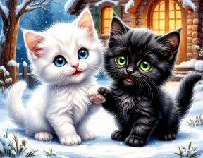 Пушистик был очень любопытный, но это не мешало ему быть немного трусишкой. Он любил наблюдать за всем из-под дивана, а если что-то его пугало, сразу прятался за бабушкину юбку. Черныш же был смелый и отважный. Он первым исследовал все уголки дома, забирался на самые высокие шкафы и охотился на солнечных зайчиков.