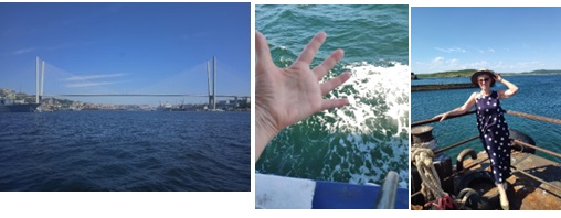 И вот мы заняли свои места, впереди, кстати, расположились карельские мама с дочкой, и паром отравляется. Известно, что провожают пароходы совсем не так, как поезда, поэтому процесс подлежит обязательному наблюдению. К тому же я не могла упустить шанс увидеть любимый Золотой мост во всей красе с залива, этот вид, как говорил один мой знакомый, «более великолепен». Чуть позднее, когда вышли из Золотого Рога, открылся настолько же прекрасный Русский мост, наконец-то при ясной погоде, но издалека. Довольно долго нас сопровождали чайки, сперва много, потом осталось две, вспомнилась песня из фильма «Попутного ветра, Синяя птица»: чайки за кормой верны кораблю, а ветрам облака…