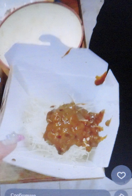 - Вот такой соус ... ( Смех за кадром ! ) Каковы ваши впечатления , Александра ? ( Явно удивлённая содержимым коробочки с соусом Александра чуть не падает со стула от смеха ! ) Короче , это очень неаппетитно ! А вот здесь заваривается сырный "Дошик" , который похож на блевотину ! Романтический ужин , все дела ... Вот ... Сашеньке и Катеньке было лень готовить и они решили потратить деньги на вот ЭТО вот ...