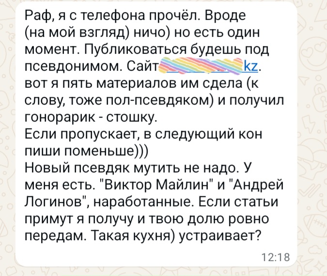 Комментатор по контекстам с потенциалом и мастер приятных формулировок, знающий как обернуть речь в бархат - Рафаэль Балгин, но, вероятно, выйду как "Виктор Майлин" или "Андрей Логинов", о чем свидетельсивует скриншот переписки с человеком, который обещал мне пристроить материал кое-куда и за кое-какую копеечку, чтобы мои штаны еще могли держаться на мне. 12.10.2025.