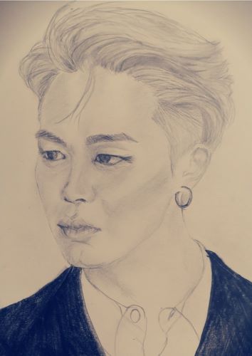 На рисунке был изображен Пак Чимин в ореоле цветов эсмеральдо. Но вы помните, как нашивсе , в ранах, когда проигрывали, одевали смешное на аэропортный лук. То ушки кролика, то ободочки на лицо – лепестки, просто ходячие цветочки. И здесь лицо Чимина в обрамлении эсмеральдо. Классная работа. У Танюши даже в черно-белом изображении было столько использовано оттенков, что выглядело все на загляденье и вызывало белую зависть, насколько очаровательно - нежно.