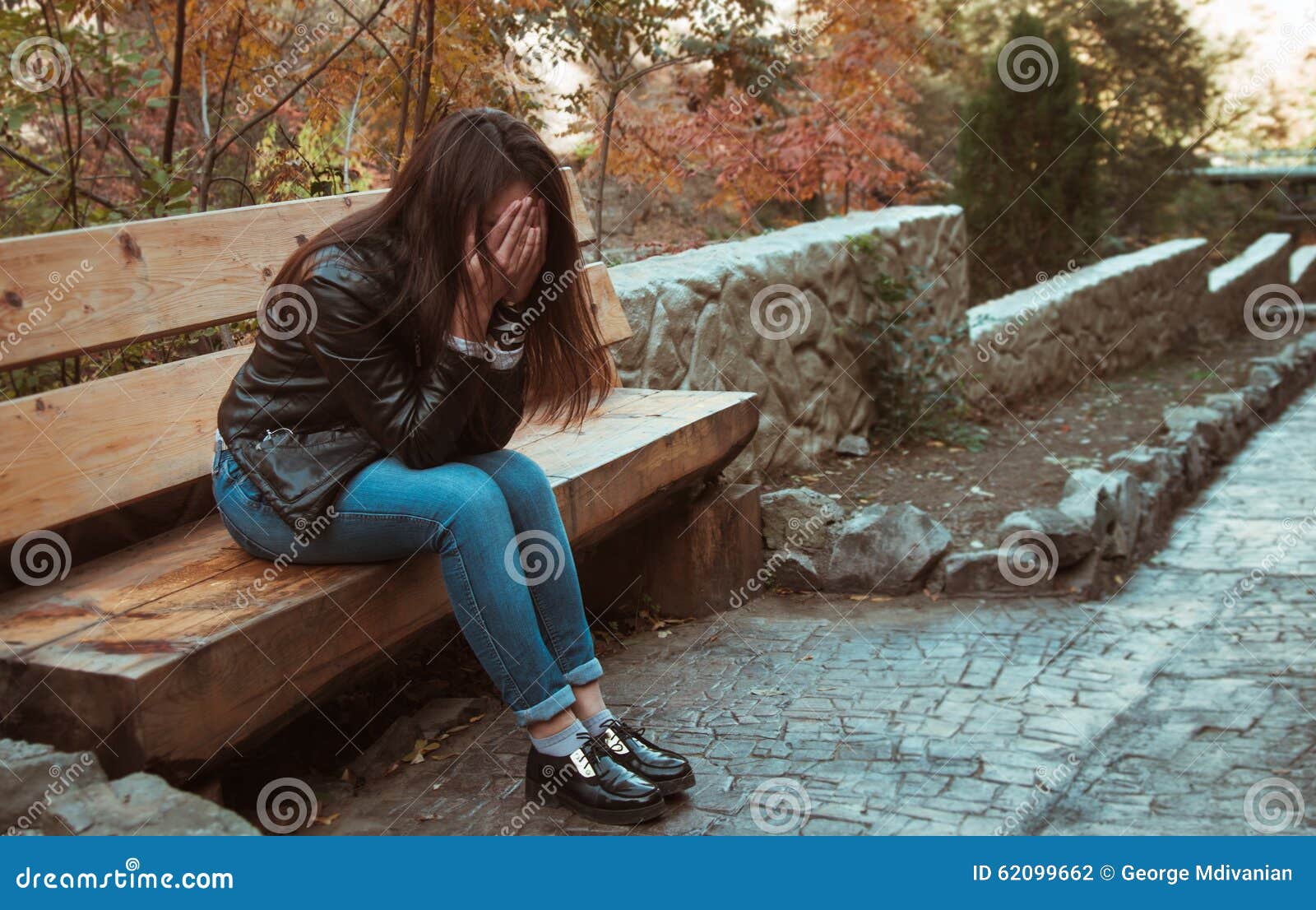 В парке на скамейке девушка сидит