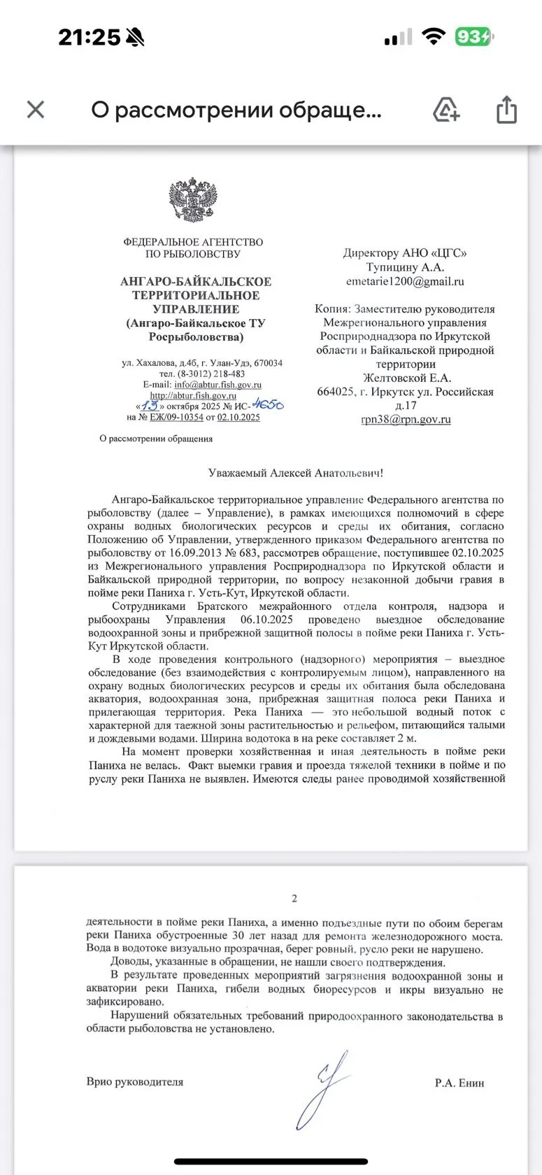 Ангаро-Байкальское управление Росрыболовства, прислало нам отписку, по ситуации с варварской добычей гравия в пойме реки Паниха 25 сентября 2025 года, которую документально зафиксировали фотографиями очевидцы. На фото видно, что прямо по пойме реки едет самосвал, в за кустами большой экскаватор грузит гравий, черпая его прямо из реки.