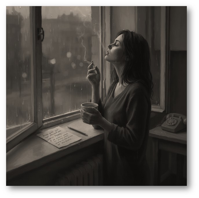На кухне тихо. Вода капает в раковину, дождь подхватывает этот ритм, и получается музыка — простая, ровная, как оттепель. Отложив письмо, я подхожу к окну, распахиваю настежь. Капли касаются лица, холодные, как чужие пальцы. Я прикуриваю сигарету, смотрю, как пепел падает на подоконник и смешивается с дождём, образуя мутные лужицы.