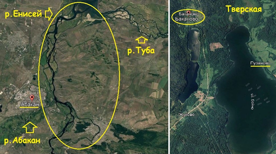 Также в других местах названия Абаканово, Баканово расположены у "женских" гидронимов, как например деревня Баканово в Тверской области на фото. Хотя, деревня расположена у одноимённого озера Бакановского, название деревни относится к соседнему озеру Бойно. Деревня Пузаново тоже выражает образ озера. Как видно, озеро имеет вид "женщины"(бабы). Так как, деревня не находится у болота или в устье реки, то начального "а"(низина) нет в названии, то есть просто "ба-кан"(водяная). Отличительной особенностью основы "кан" является полукруглая или серповидная форма гидронима или какой то его части.