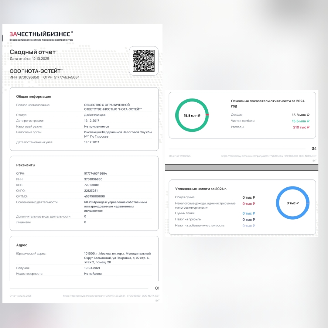 В сводном отчёте по ООО "Нота-Эстейт", основным видом деятельности которого была заявлена аренда и управление собственным или арендованным недвижимым имуществом (68.20) отсутствуют какие-либо сведения об уплате налогов.