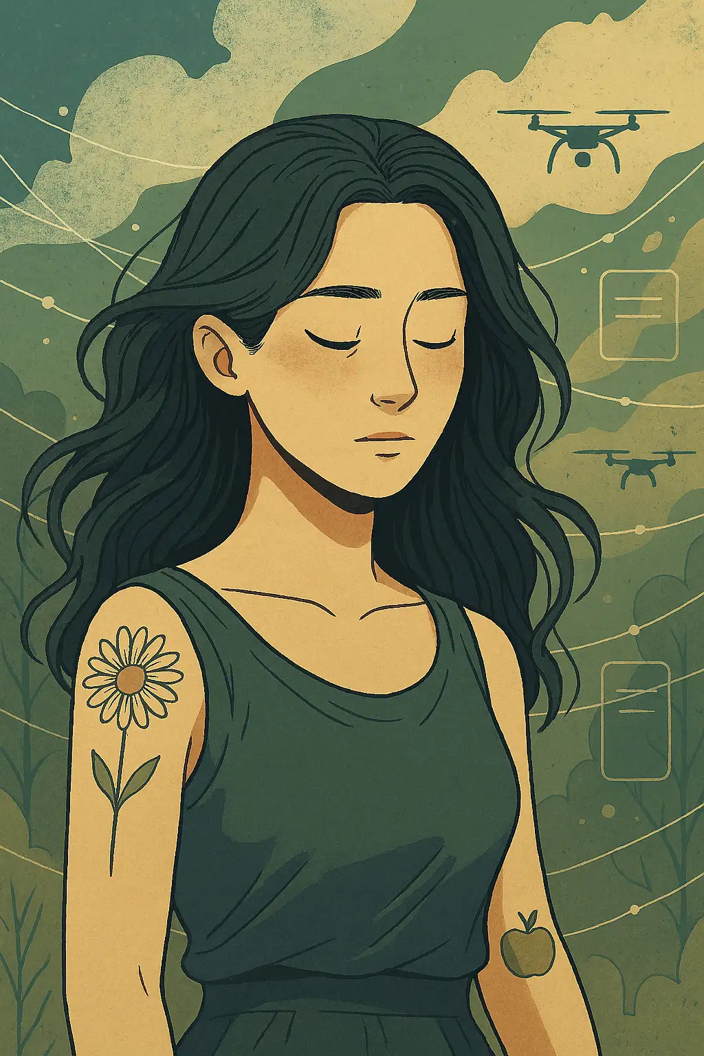 Смесь природы и технологий, где деревья растут рядом с прозрачными экранами, а птицы поют рядом с дронами.