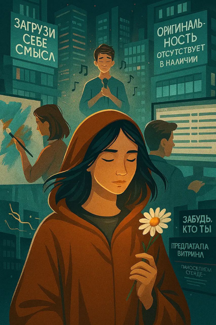 В городе, где раньше торговали ощущениями, теперь продавали цели: «Скачай себе смысл», — предлагала витрина, «Забудь, кто ты», — бонусом, на соседнем стенде — «Оригинальность - отсутствует в наличии»... Айна прошла мимо, оставив ромашку — как знак. Не протеста, а напоминания: важно не то, что работает, а то, что живёт.