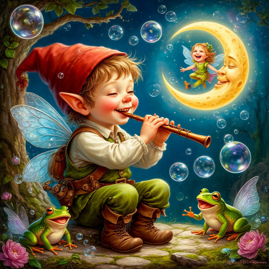 Мгновение — и гномик взмыл вверх на мыльном пузыре, сверкающем как комета! Пузырь поднимался всё выше, мимо лунных облаков, пока не шлёпнулся прямо… в серебристый кратер.